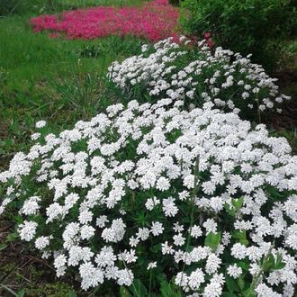 Иберис (Iberis) – травянистый полукустарник, достигающий высоты от 30 до 40 см. Листья имеют овальную форму, максимальная длина – 7 см. Их поверхность глянцевая. Шикарный изумрудный оттенок листьев красиво смотрится с цветами различного оттенка. Оно может быть от белого, желтого и до лилового. Цветочки собраны в небольшие соцветия зонтичной формы. Изюминкой этого растения является их расположение. Они так плотно ложатся друг к другу, что создается образ шара, под которым практически не видно зелени.